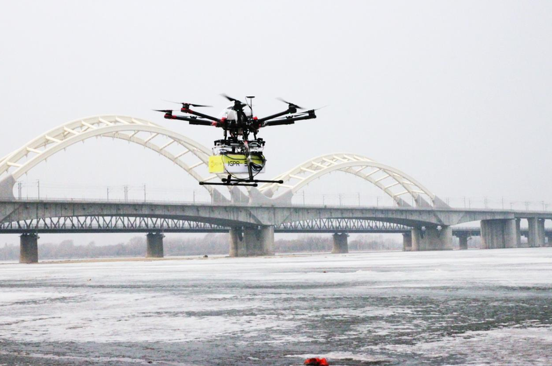 大連中睿科技發(fā)展有限公司歷時(shí)一年研發(fā)的IGPR-30無(wú)人機(jī)飛航測(cè)冰雷達(dá),2016年初在松花江哈爾濱江段試驗(yàn)成功,獲得了清晰準(zhǔn)確的連續(xù)冰層雷達(dá)圖像。飛航測(cè)冰現(xiàn)場(chǎng),系統(tǒng)飛行姿態(tài)穩(wěn)定,雷達(dá)探測(cè)成像清晰,操控靈敏,可以10-15m/s速度快速連續(xù)施測(cè),可實(shí)時(shí)獲取高精度的河流冰層連續(xù)厚度數(shù)據(jù)。IGPR-30無(wú)人機(jī)飛航測(cè)冰雷達(dá)集成了RTK精確定位系統(tǒng),可準(zhǔn)確測(cè)量記錄飛航測(cè)線軌跡,并與GIS地圖融合。IGPR-30無(wú)人機(jī)飛航測(cè)冰雷達(dá)是河流冰情觀測(cè)的創(chuàng)新性技術(shù)設(shè)備,為河流冰情快速精準(zhǔn)測(cè)量和河流凌汛應(yīng)急探測(cè)提供了先進(jìn)的高效率的技術(shù)手段。